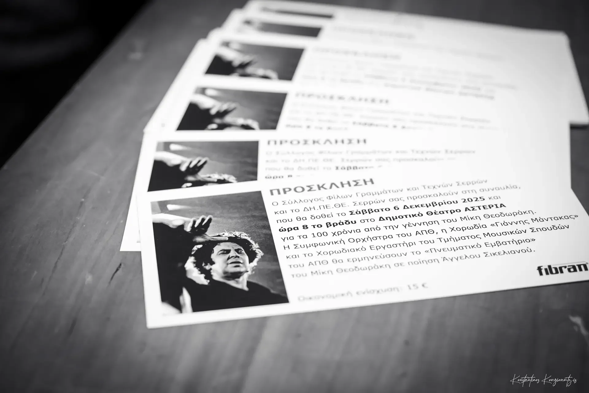 Ο Σύλλογος Φίλων Γραμμάτων και Τεχνών Σερρών προσκάλεσε τη χορωδία «Γιάννης Μάντακας», το Χορωδιακό Εργαστήρι του ΤΜΣ και τη Συμφωνική Ορχήστρα του ΑΠΘ στις Σέρρες, για τη διοργάνωση επετειακής συναυλίας προς τιμήν των 100 χρόνων από τη γέννηση του Μίκη Θεοδωράκη. Το Δημοτικό Θέατρο «Αστέρια» πλημμύρισε από κόσμο που απόλαυσε το «Πνευματικό Εμβατήριο» σε ποίηση Άγγελου Σικελιανού και αποσπάσματα από το «Άξιον Εστί» σε ποίηση Οδυσσέα Ελύτη. Την ορχήστρα διηύθυνε ο Βλαδίμηρος Συμεωνίδης, και τα σολιστικά μέρη είχαν η Μέλα Γεροφώτη και ο Απόστολος Σωτηρούδης.