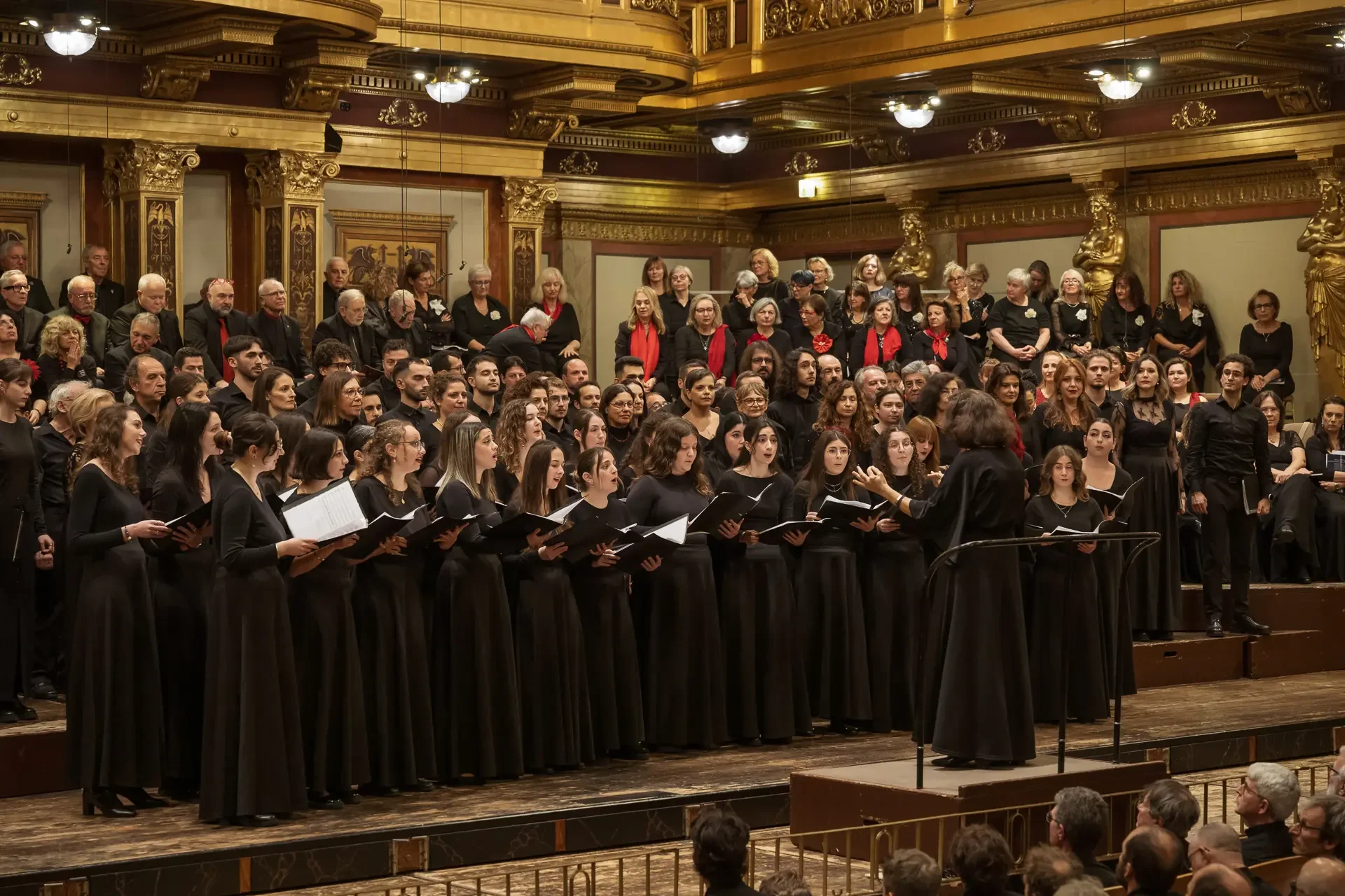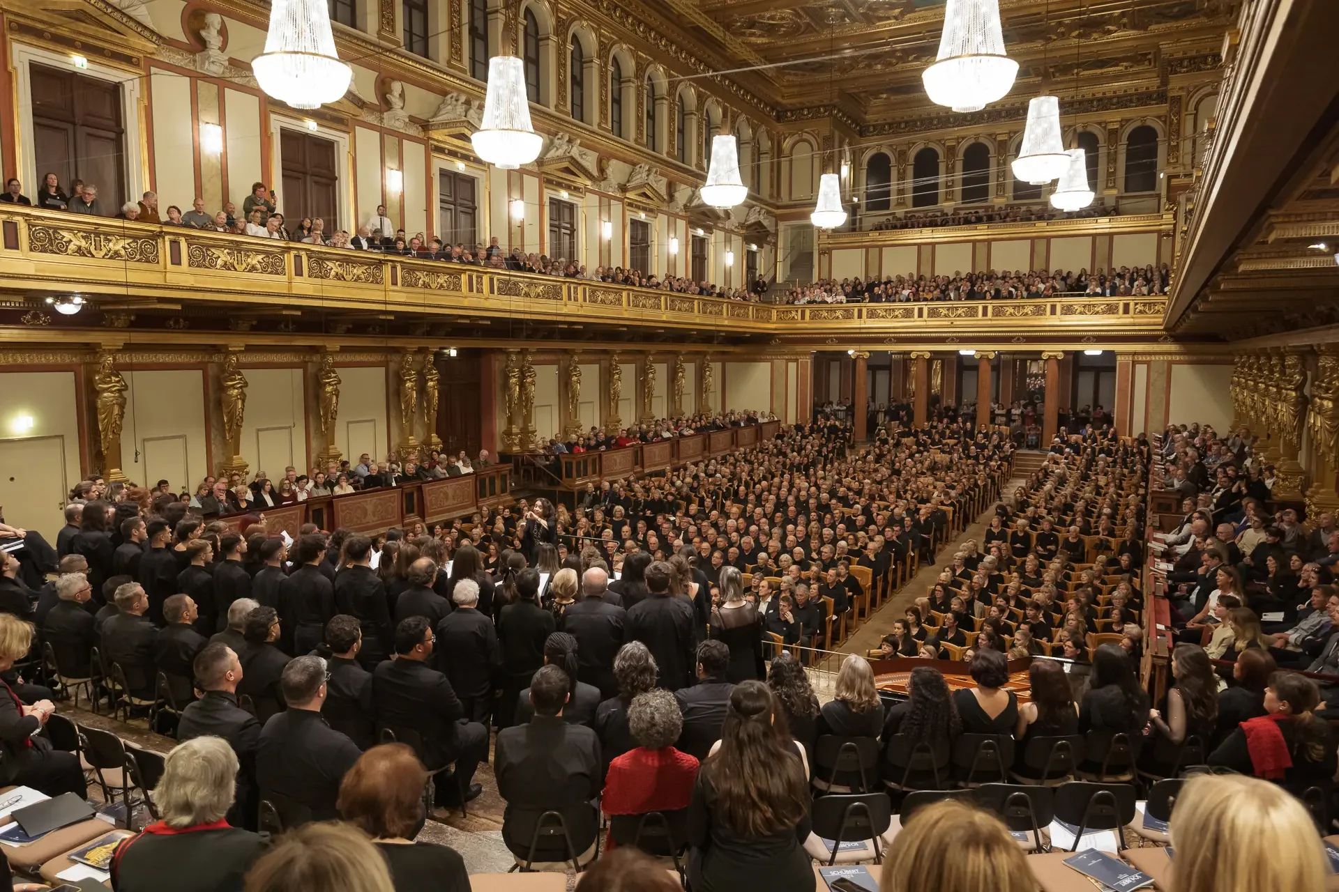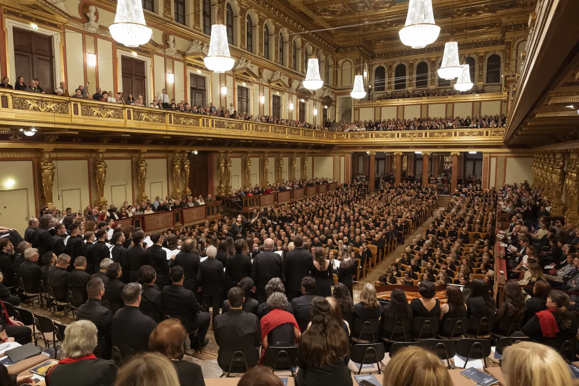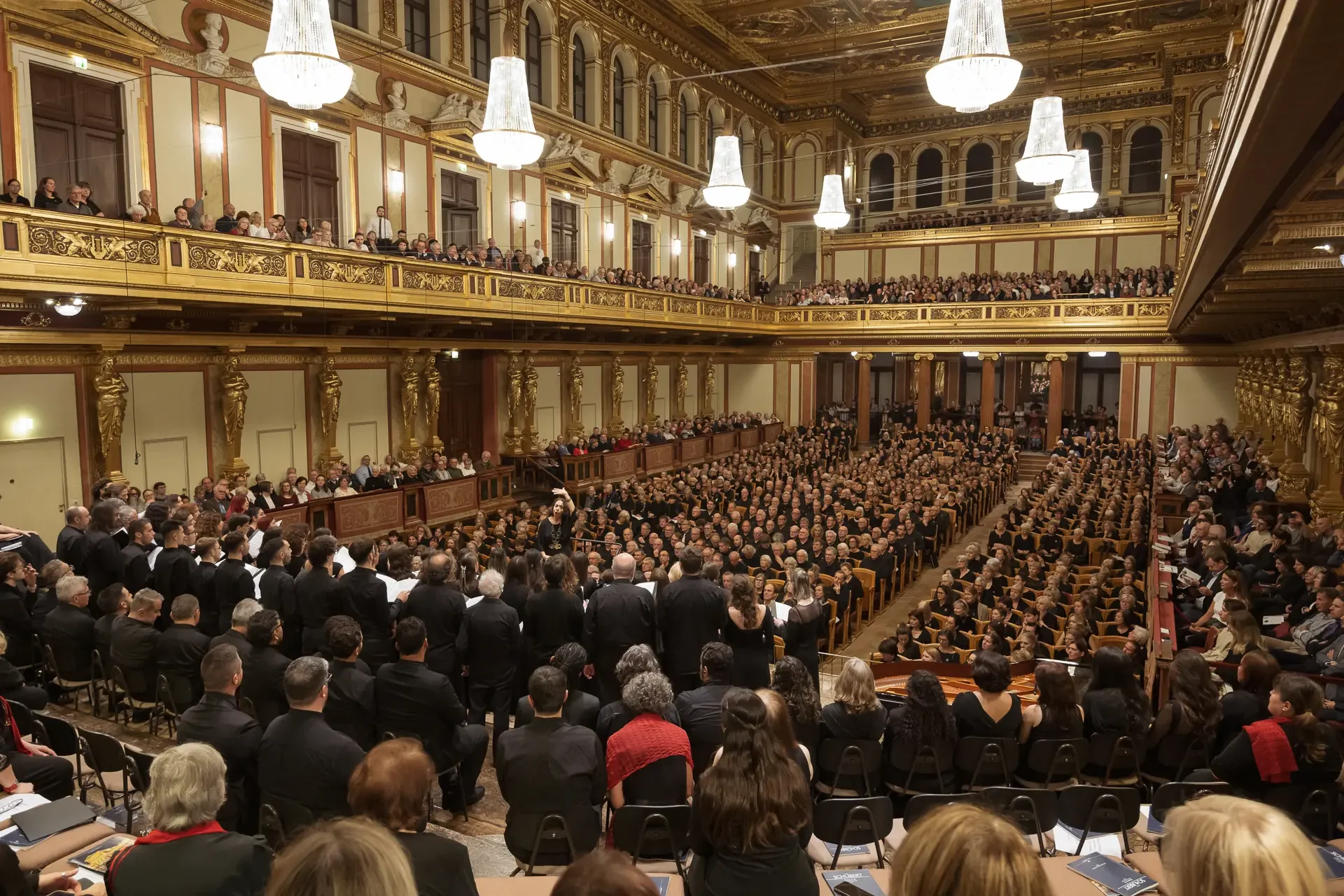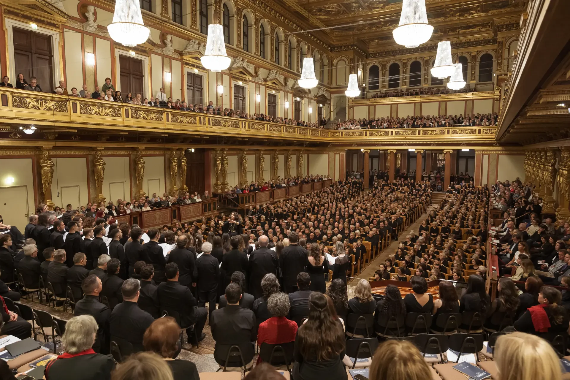 Η κεντρική συναυλία του φεστιβάλ στη Βιέννη δόθηκε στην ιστορική Χρυσή Αίθουσα του Musikverein, όπου 1000 χορωδοί από όλο τον κόσμο ένωσαν τις φωνές τους, ερμηνεύοντας την εμβληματική, τελευταία «Λειτουργία σε Μι ύφεση μείζονα» του Franz Schubert. Μαέστρος της βραδιάς ήταν ο Heinz Ferlesch. Η συναυλία ξεκίνησε με μικρά μουσικά δωράκια, καθότι 9 χορωδίες, ανάμεσα στις οποίες και η δική μας, είχαν την ευκαιρία να ερμηνεύσουν ένα σύντομο πρόγραμμα της επιλογής τους. Παραμένοντας πιστοί στο επετειακό έτος για τα 100 χρόνια από τη γέννηση των Μάνου Χατζιδάκι και Μίκη Θεοδωράκη, παρουσιάσαμε «Το Τριαντάφυλλο» και «Με το Λύχνο του Άστρου» υπό τη διεύθυνση της μαέστρου μας, Εριφύλης Δαμιανού.