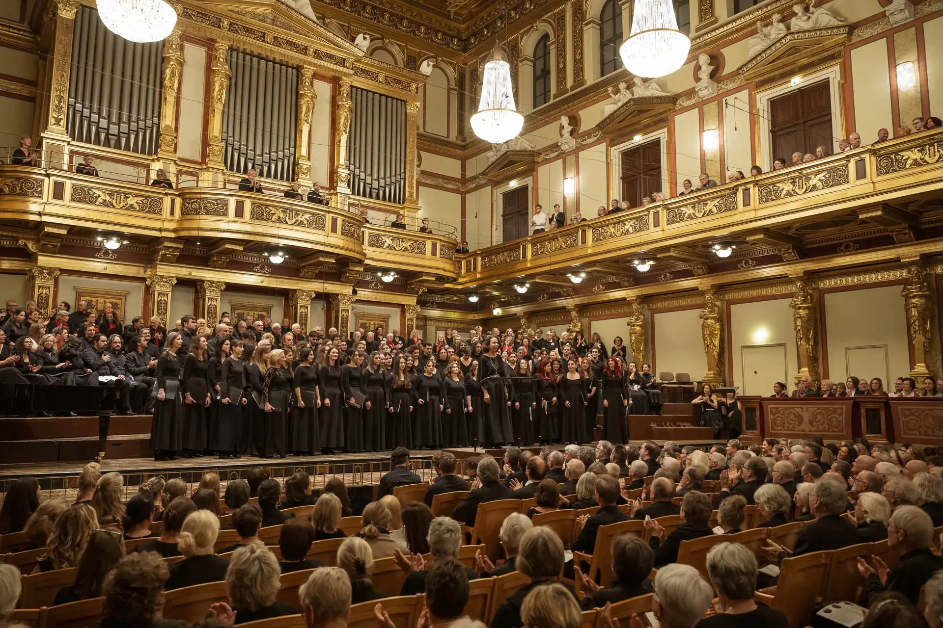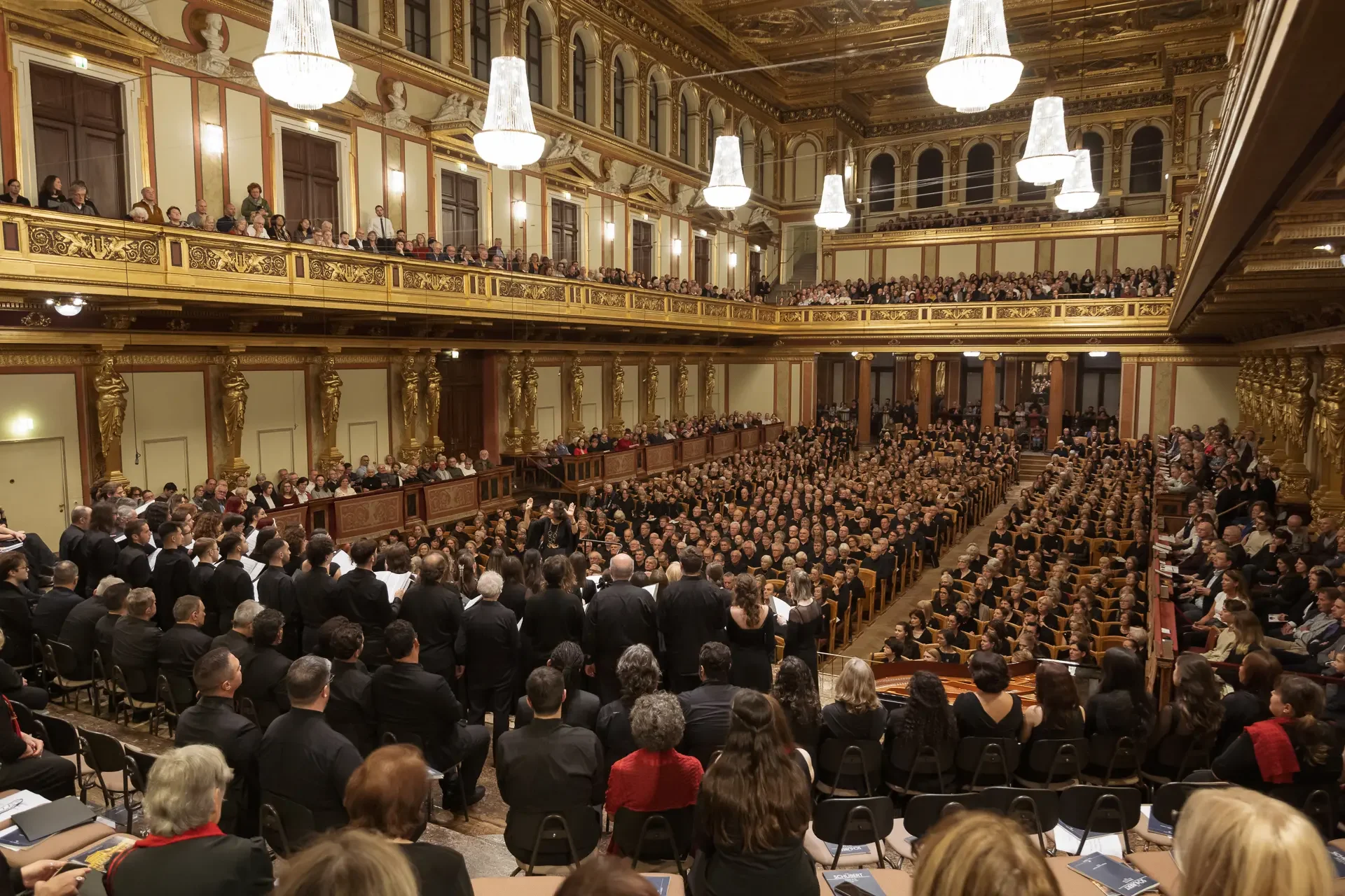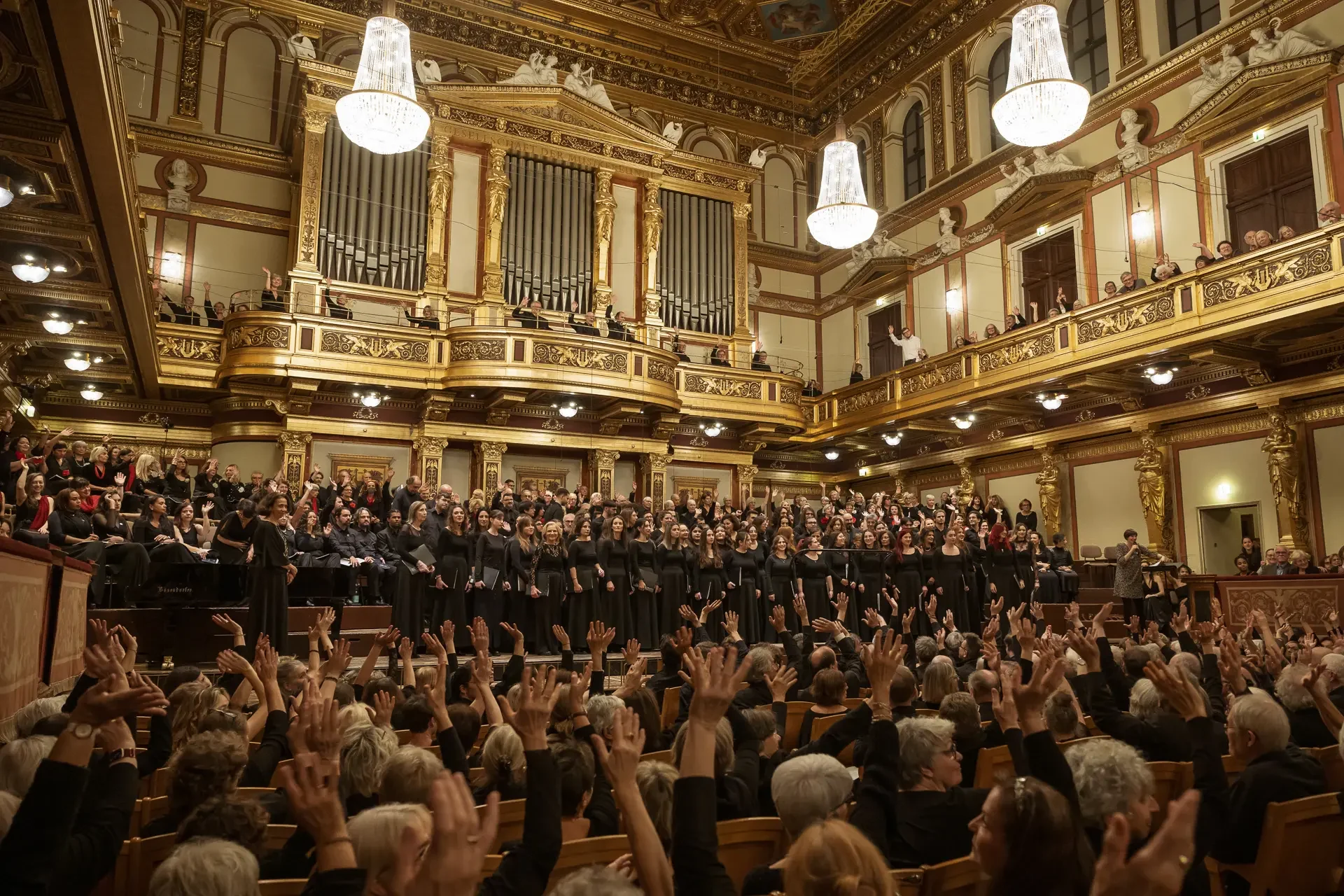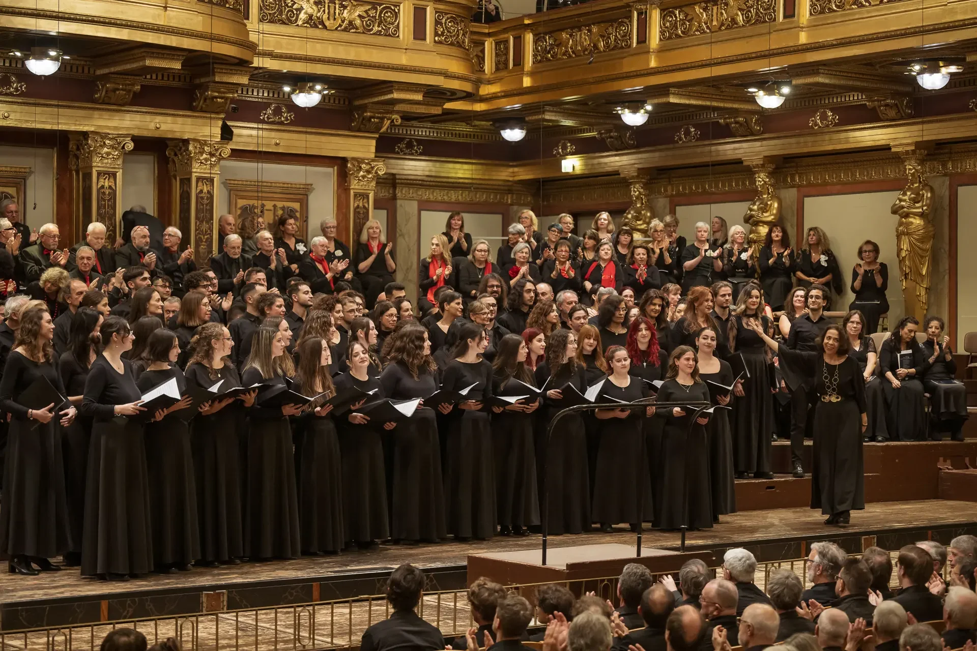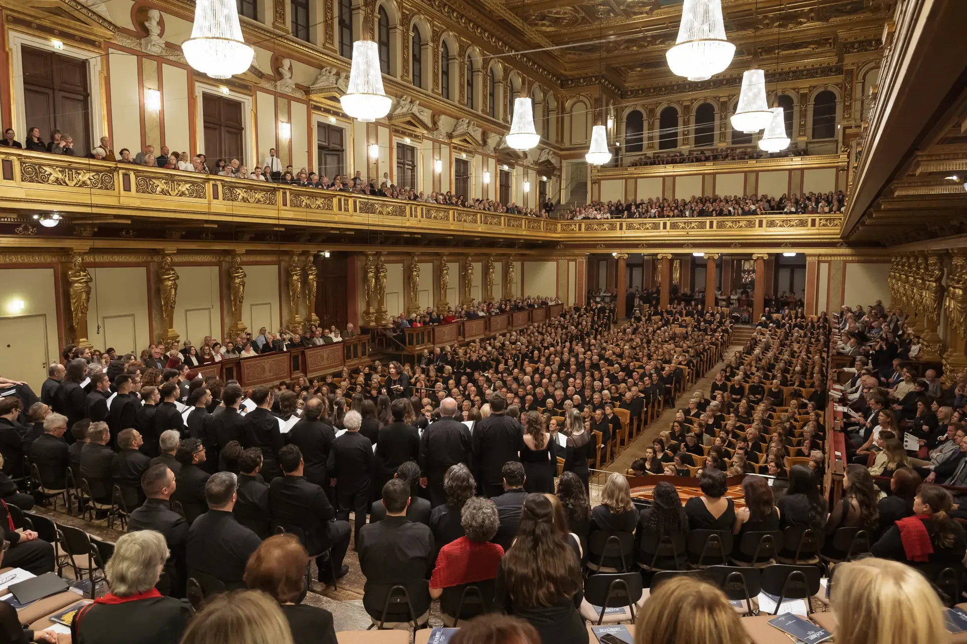Η κεντρική συναυλία του φεστιβάλ στη Βιέννη δόθηκε στην ιστορική Χρυσή Αίθουσα του Musikverein, όπου 1000 χορωδοί από όλο τον κόσμο ένωσαν τις φωνές τους, ερμηνεύοντας την εμβληματική, τελευταία «Λειτουργία σε Μι ύφεση μείζονα» του Franz Schubert. Μαέστρος της βραδιάς ήταν ο Heinz Ferlesch. Η συναυλία ξεκίνησε με μικρά μουσικά δωράκια, καθότι 9 χορωδίες, ανάμεσα στις οποίες και η δική μας, είχαν την ευκαιρία να ερμηνεύσουν ένα σύντομο πρόγραμμα της επιλογής τους. Παραμένοντας πιστοί στο επετειακό έτος για τα 100 χρόνια από τη γέννηση των Μάνου Χατζιδάκι και Μίκη Θεοδωράκη, παρουσιάσαμε «Το Τριαντάφυλλο» και «Με το Λύχνο του Άστρου» υπό τη διεύθυνση της μαέστρου μας, Εριφύλης Δαμιανού.