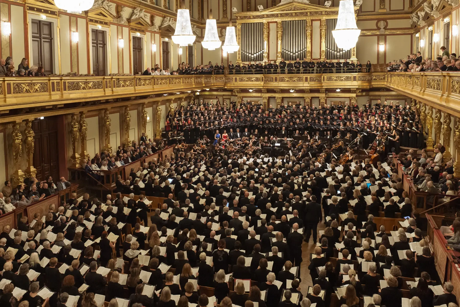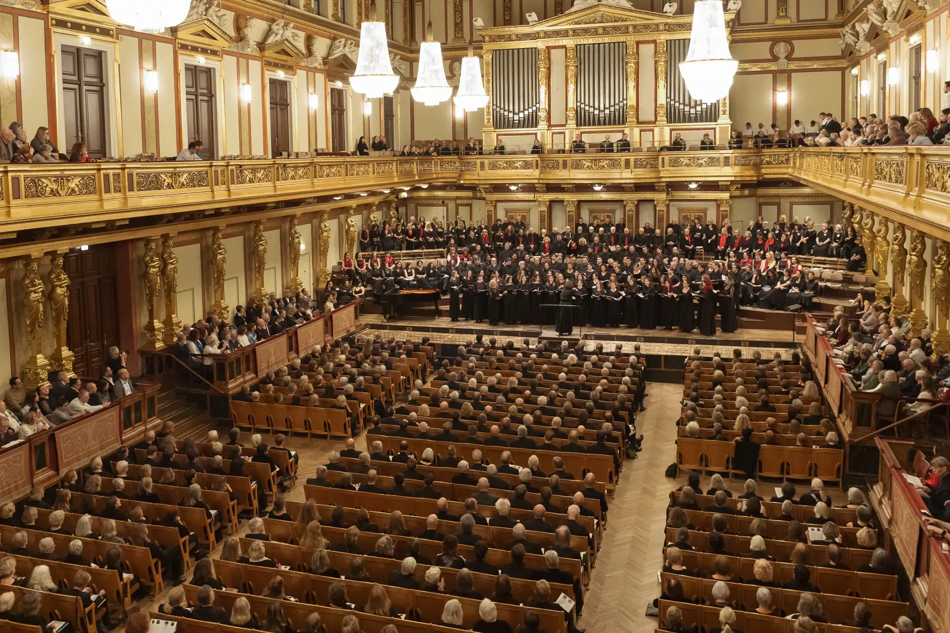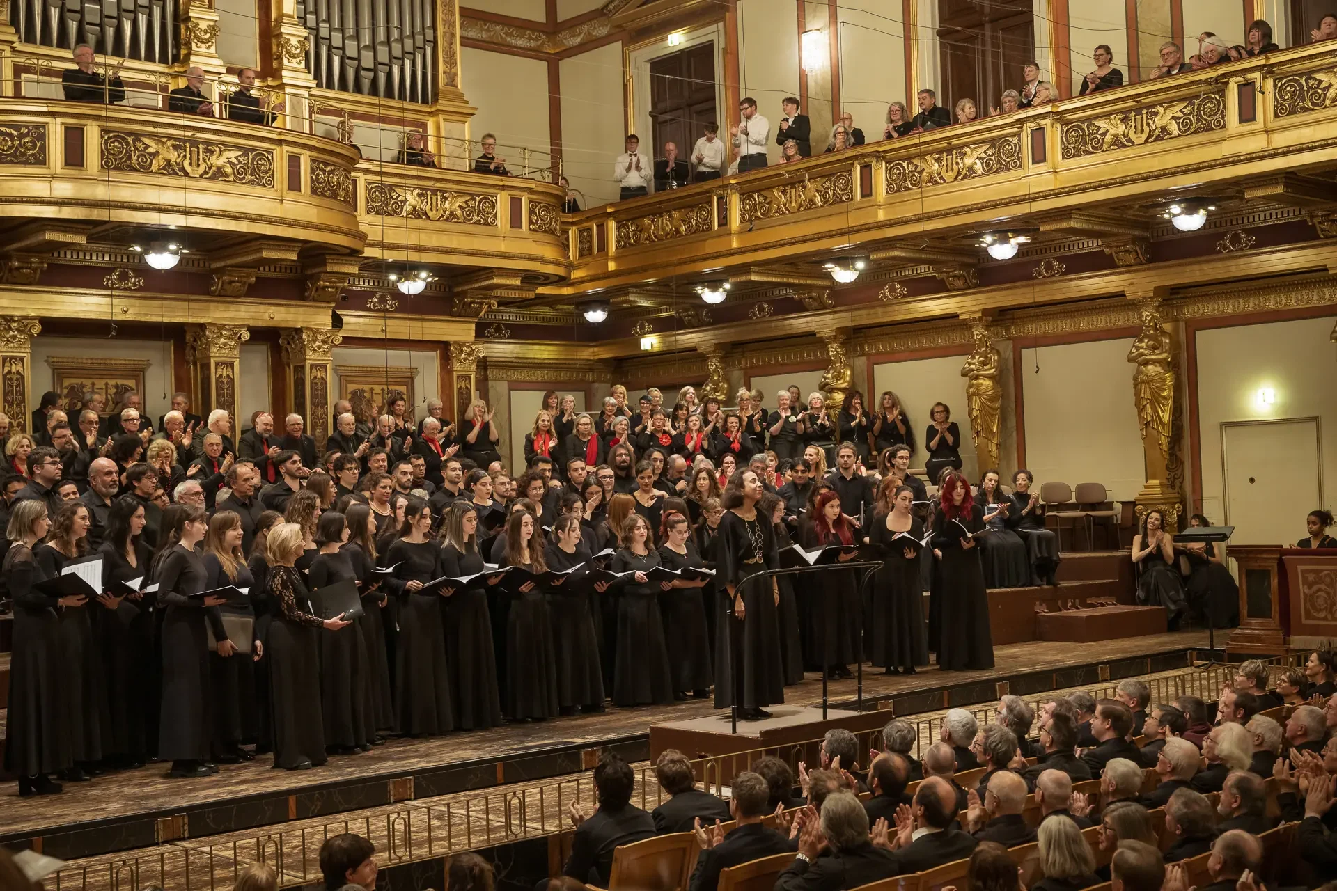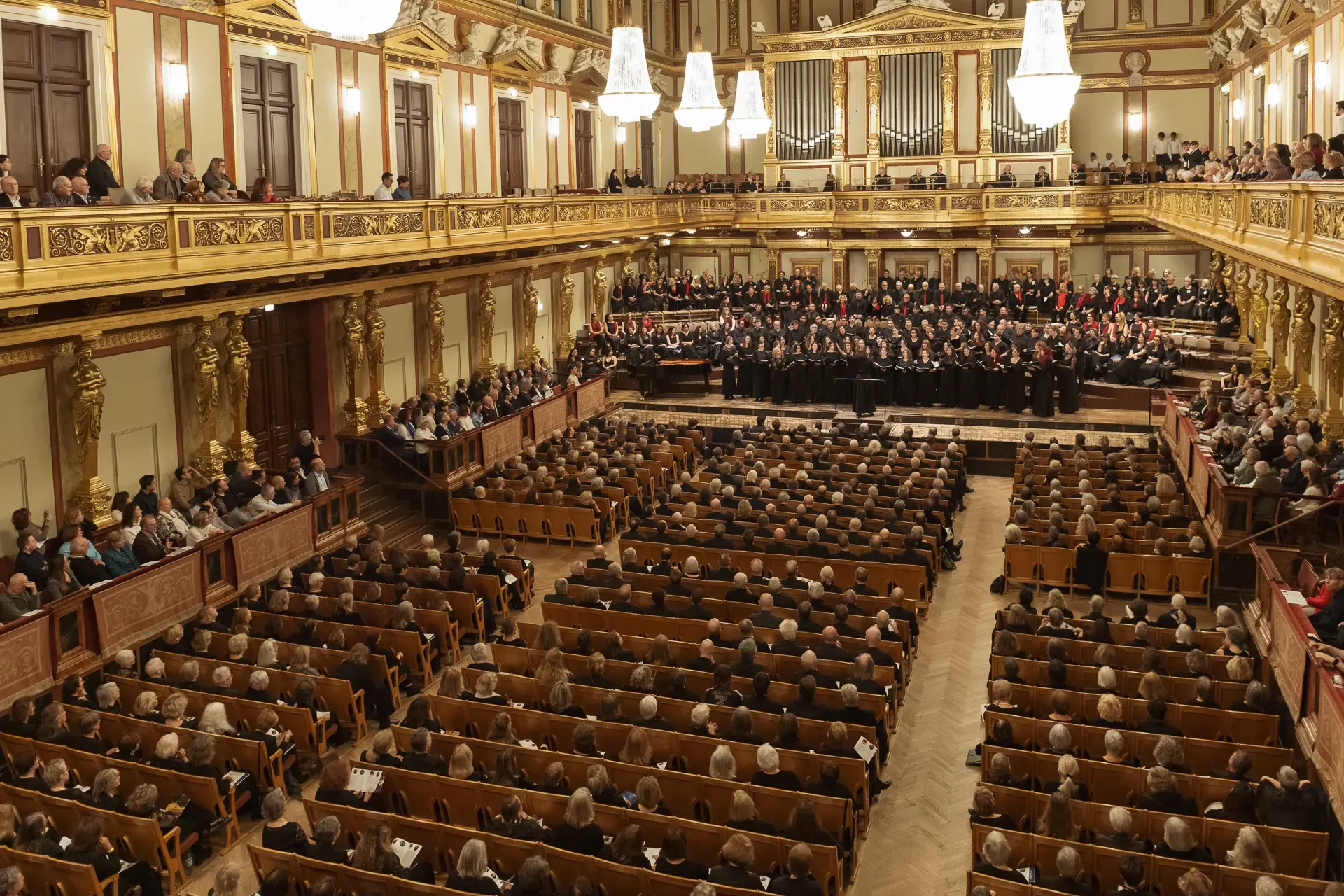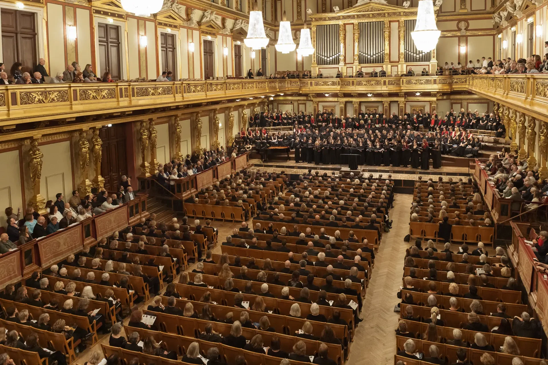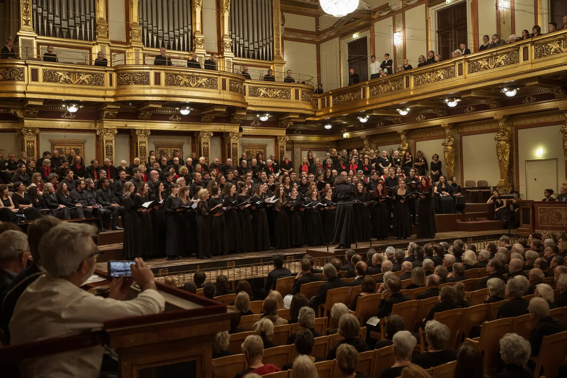 Η κεντρική συναυλία του φεστιβάλ στη Βιέννη δόθηκε στην ιστορική Χρυσή Αίθουσα του Musikverein, όπου 1000 χορωδοί από όλο τον κόσμο ένωσαν τις φωνές τους, ερμηνεύοντας την εμβληματική, τελευταία «Λειτουργία σε Μι ύφεση μείζονα» του Franz Schubert. Μαέστρος της βραδιάς ήταν ο Heinz Ferlesch. Η συναυλία ξεκίνησε με μικρά μουσικά δωράκια, καθότι 9 χορωδίες, ανάμεσα στις οποίες και η δική μας, είχαν την ευκαιρία να ερμηνεύσουν ένα σύντομο πρόγραμμα της επιλογής τους. Παραμένοντας πιστοί στο επετειακό έτος για τα 100 χρόνια από τη γέννηση των Μάνου Χατζιδάκι και Μίκη Θεοδωράκη, παρουσιάσαμε «Το Τριαντάφυλλο» και «Με το Λύχνο του Άστρου» υπό τη διεύθυνση της μαέστρου μας, Εριφύλης Δαμιανού.