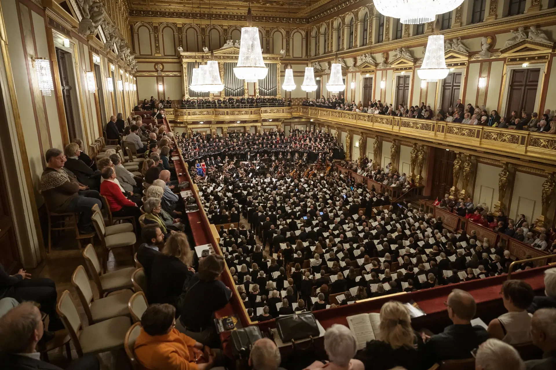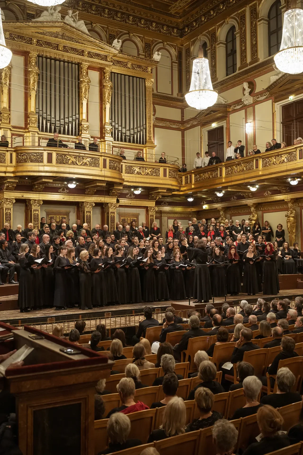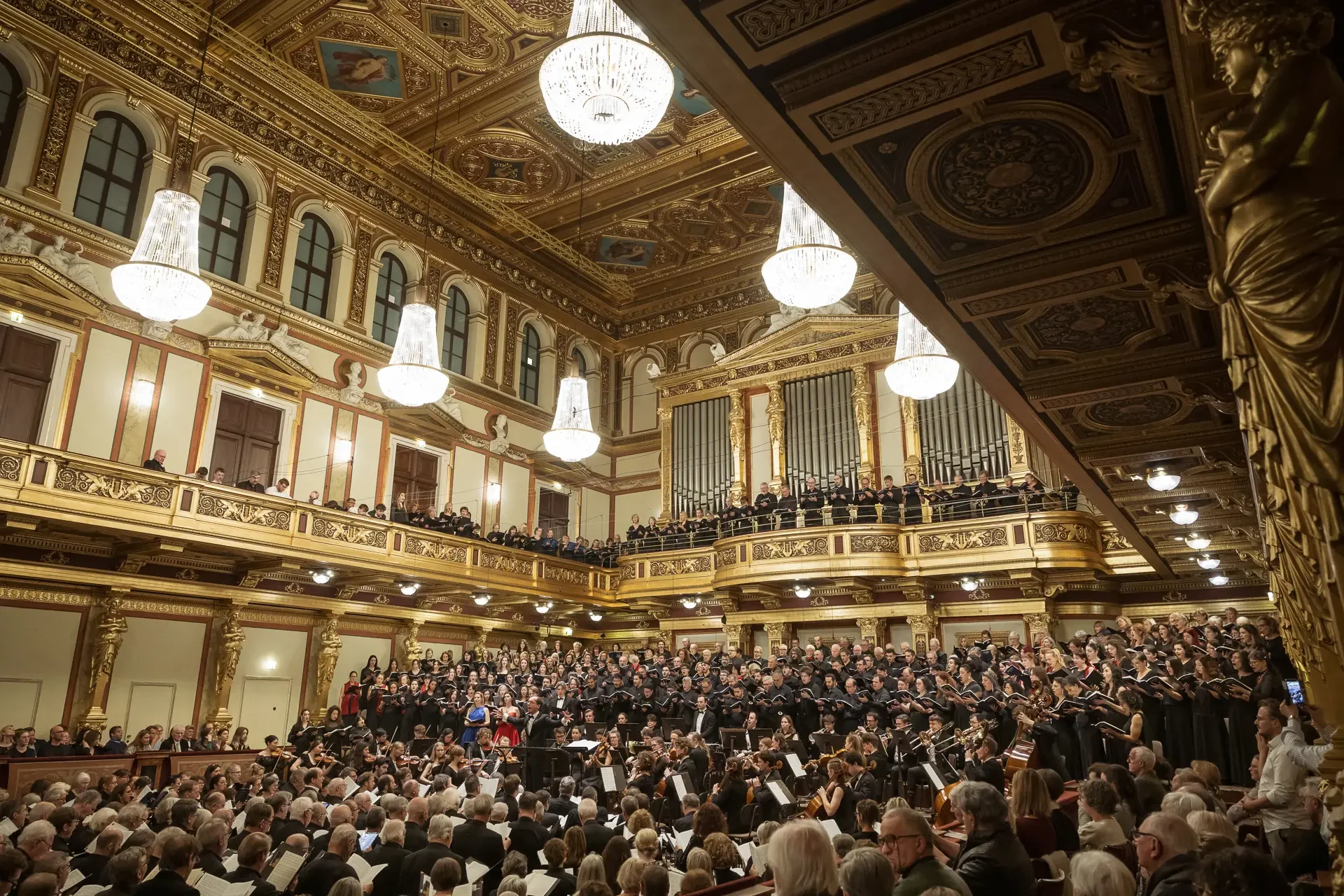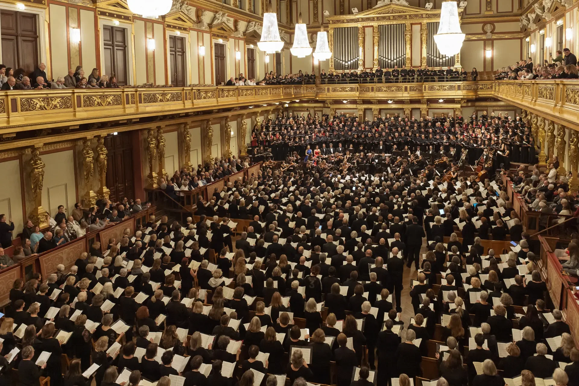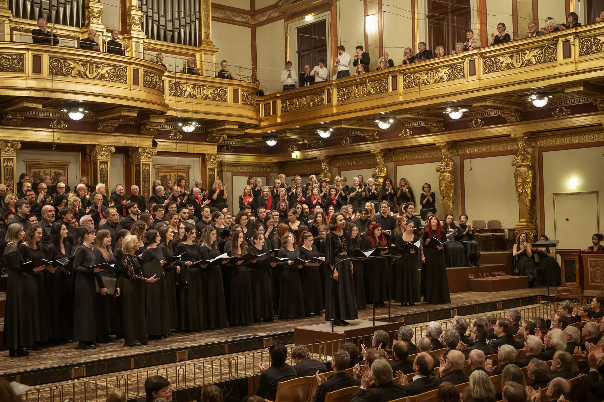 Η κεντρική συναυλία του φεστιβάλ στη Βιέννη δόθηκε στην ιστορική Χρυσή Αίθουσα του Musikverein, όπου 1000 χορωδοί από όλο τον κόσμο ένωσαν τις φωνές τους, ερμηνεύοντας την εμβληματική, τελευταία «Λειτουργία σε Μι ύφεση μείζονα» του Franz Schubert. Μαέστρος της βραδιάς ήταν ο Heinz Ferlesch. Η συναυλία ξεκίνησε με μικρά μουσικά δωράκια, καθότι 9 χορωδίες, ανάμεσα στις οποίες και η δική μας, είχαν την ευκαιρία να ερμηνεύσουν ένα σύντομο πρόγραμμα της επιλογής τους. Παραμένοντας πιστοί στο επετειακό έτος για τα 100 χρόνια από τη γέννηση των Μάνου Χατζιδάκι και Μίκη Θεοδωράκη, παρουσιάσαμε «Το Τριαντάφυλλο» και «Με το Λύχνο του Άστρου» υπό τη διεύθυνση της μαέστρου μας, Εριφύλης Δαμιανού.