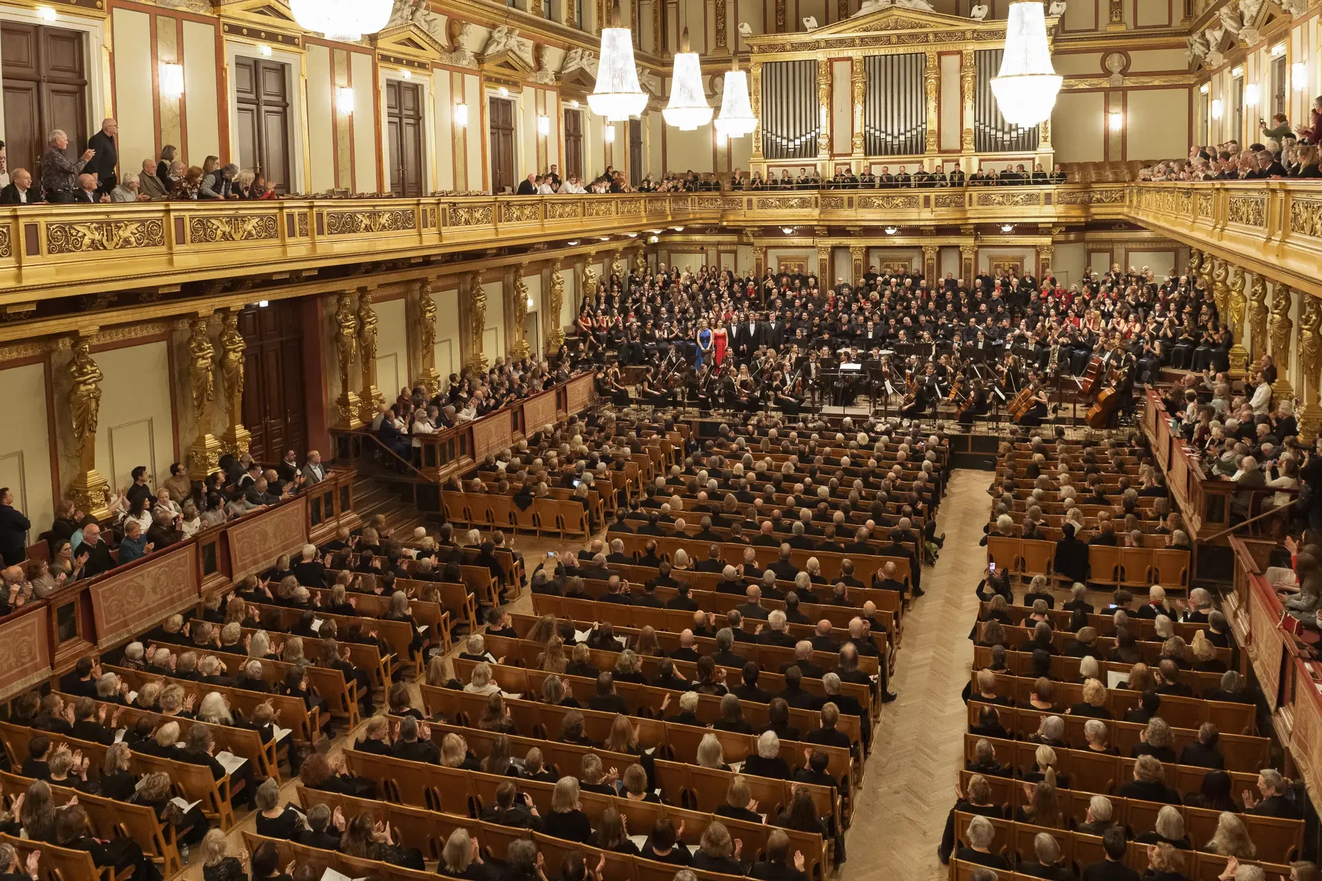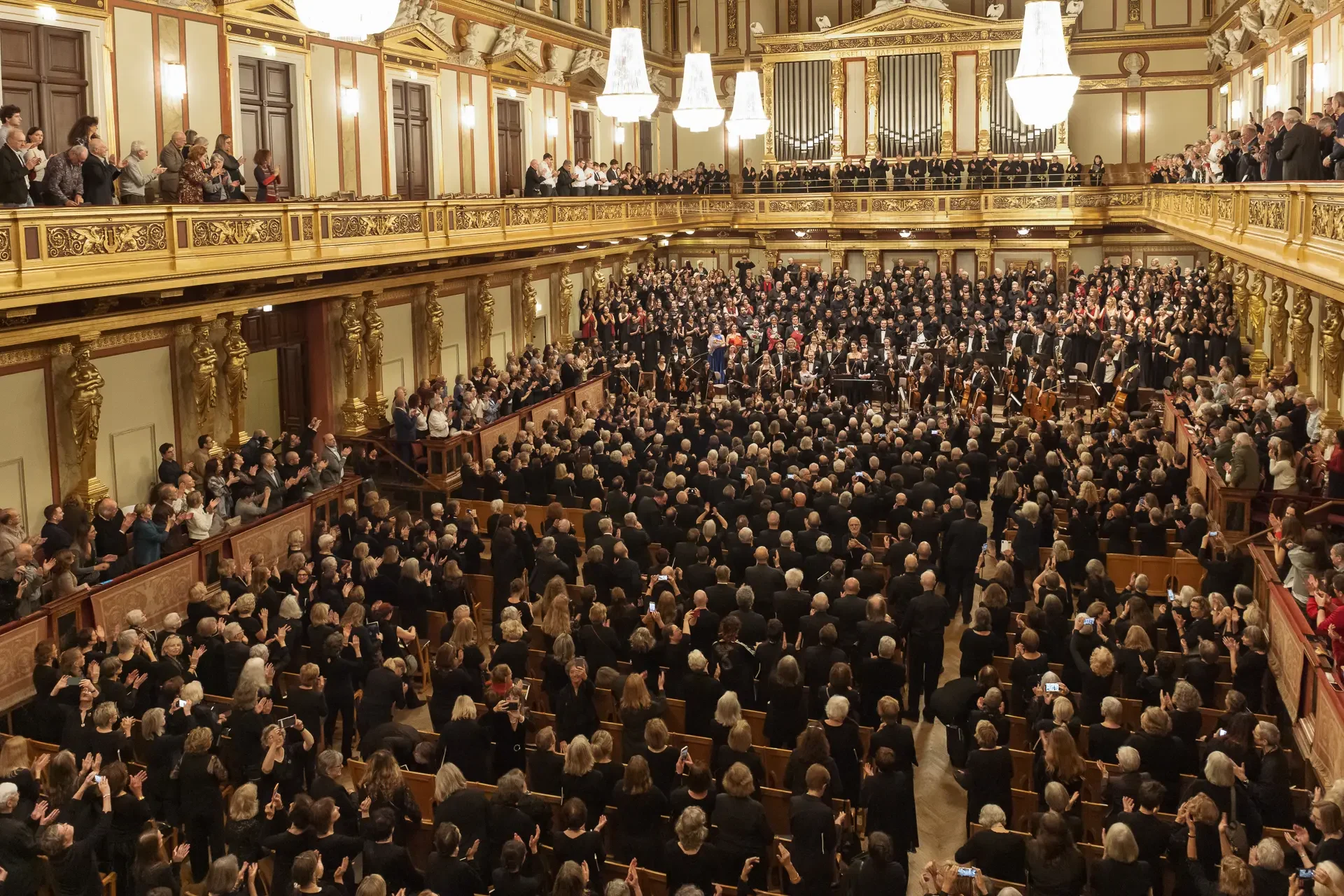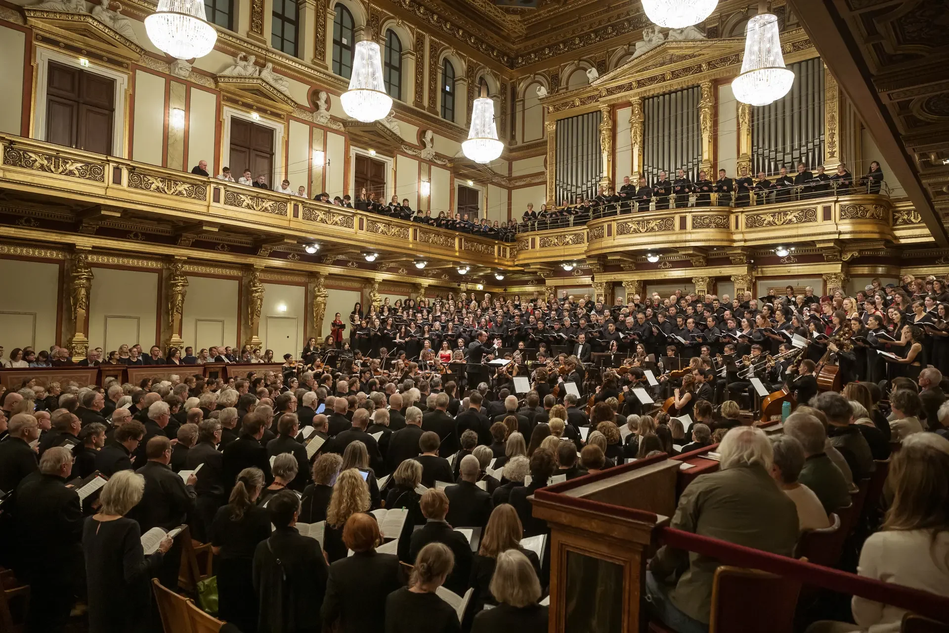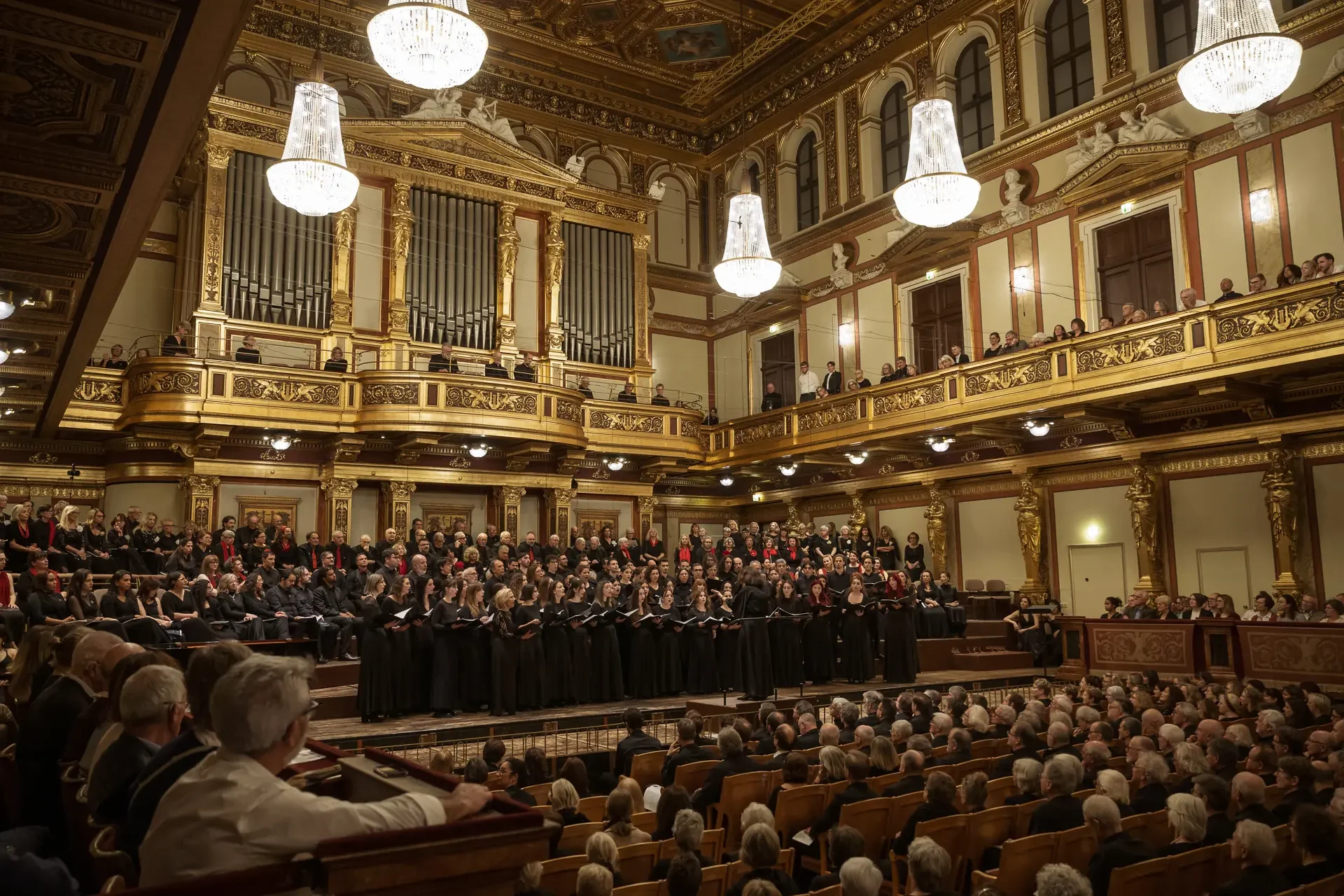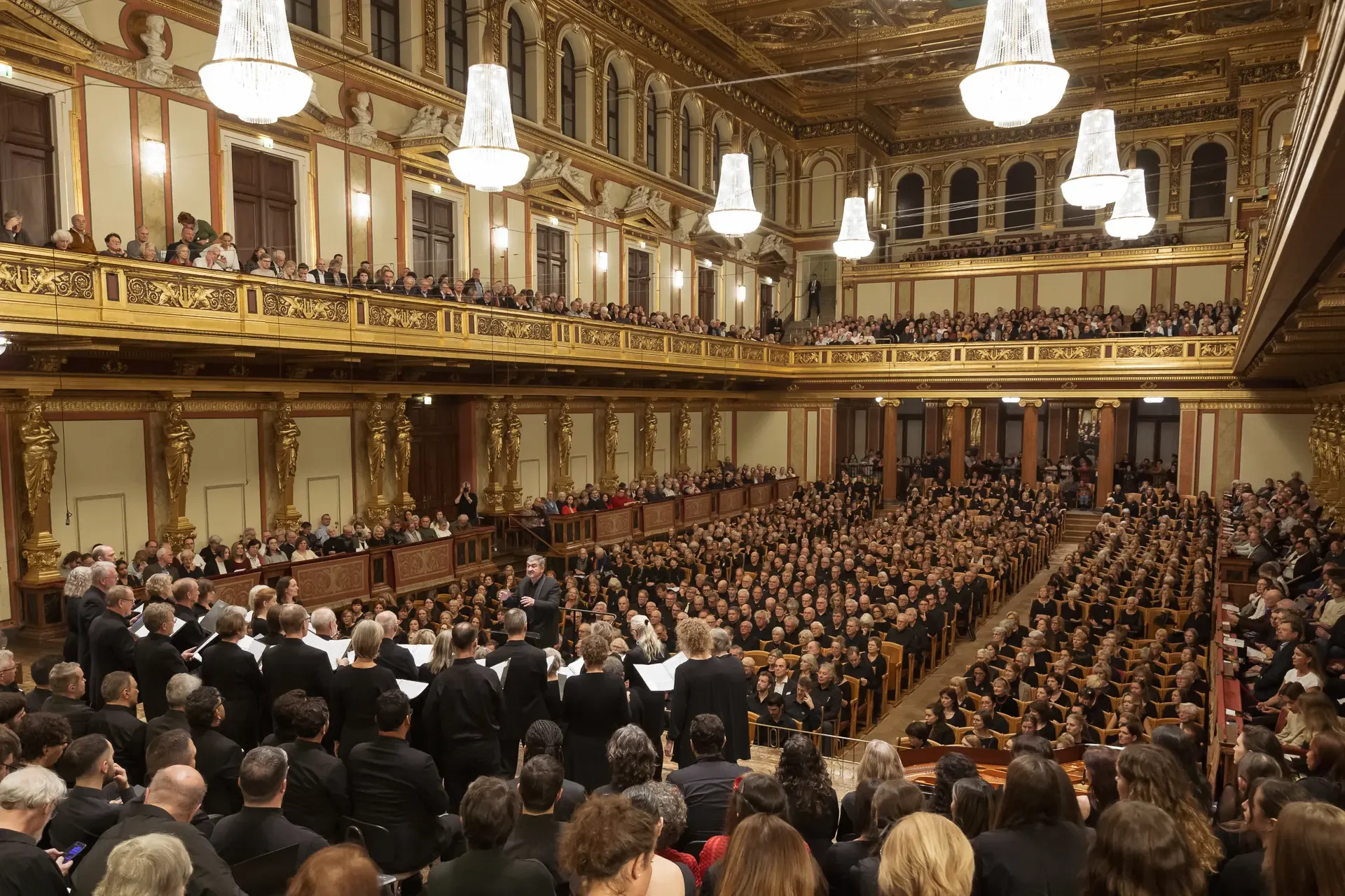Η κεντρική συναυλία του φεστιβάλ στη Βιέννη δόθηκε στην ιστορική Χρυσή Αίθουσα του Musikverein, όπου 1000 χορωδοί από όλο τον κόσμο ένωσαν τις φωνές τους, ερμηνεύοντας την εμβληματική, τελευταία «Λειτουργία σε Μι ύφεση μείζονα» του Franz Schubert. Μαέστρος της βραδιάς ήταν ο Heinz Ferlesch. Η συναυλία ξεκίνησε με μικρά μουσικά δωράκια, καθότι 9 χορωδίες, ανάμεσα στις οποίες και η δική μας, είχαν την ευκαιρία να ερμηνεύσουν ένα σύντομο πρόγραμμα της επιλογής τους. Παραμένοντας πιστοί στο επετειακό έτος για τα 100 χρόνια από τη γέννηση των Μάνου Χατζιδάκι και Μίκη Θεοδωράκη, παρουσιάσαμε «Το Τριαντάφυλλο» και «Με το Λύχνο του Άστρου» υπό τη διεύθυνση της μαέστρου μας, Εριφύλης Δαμιανού.
