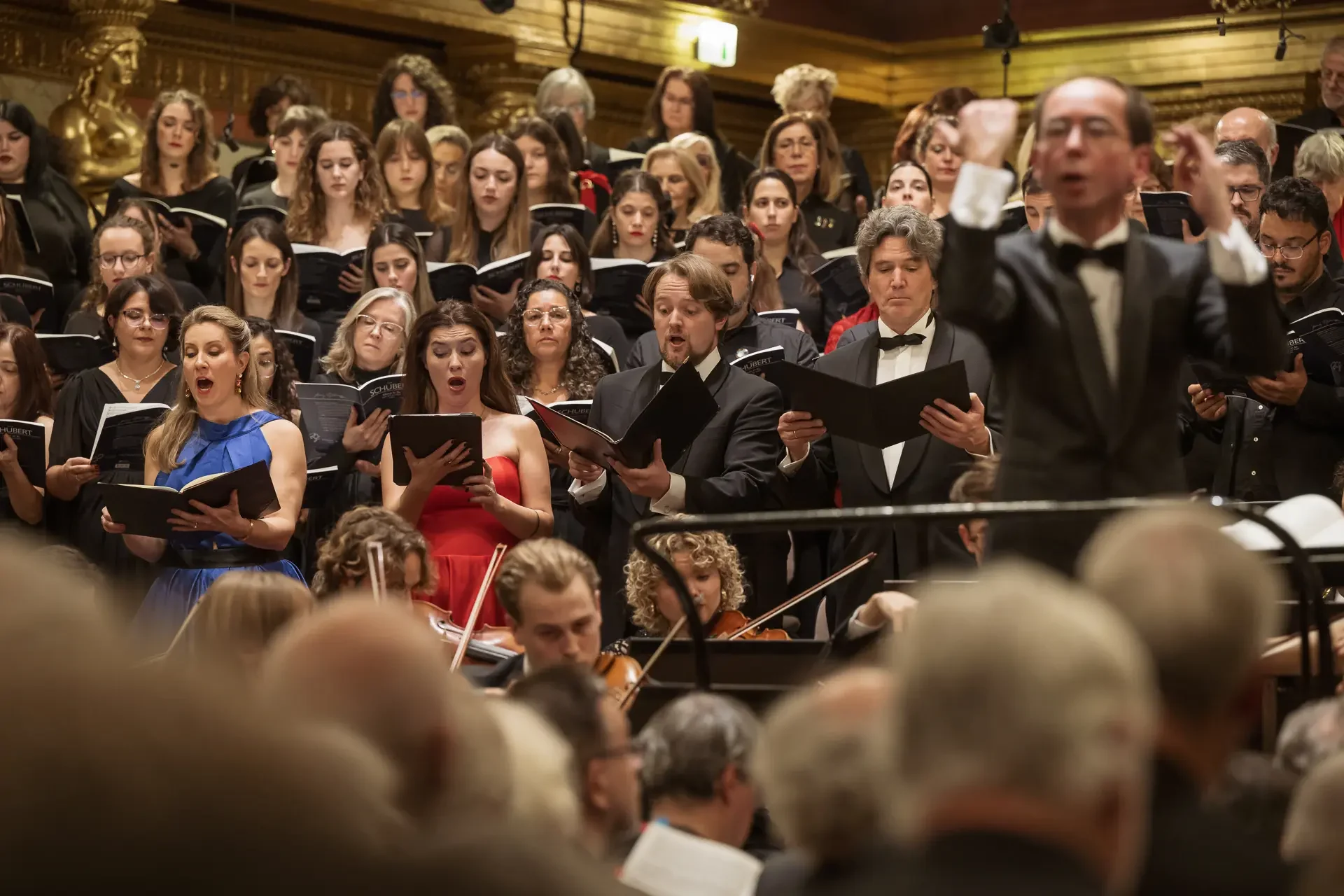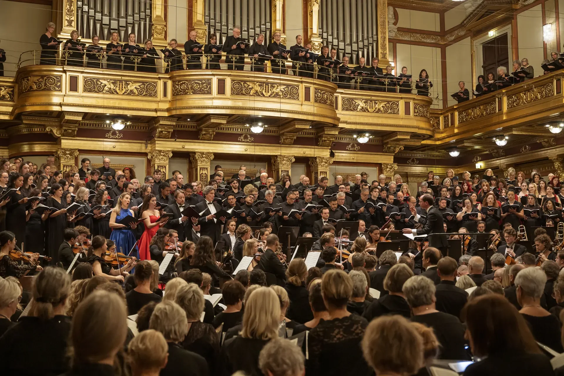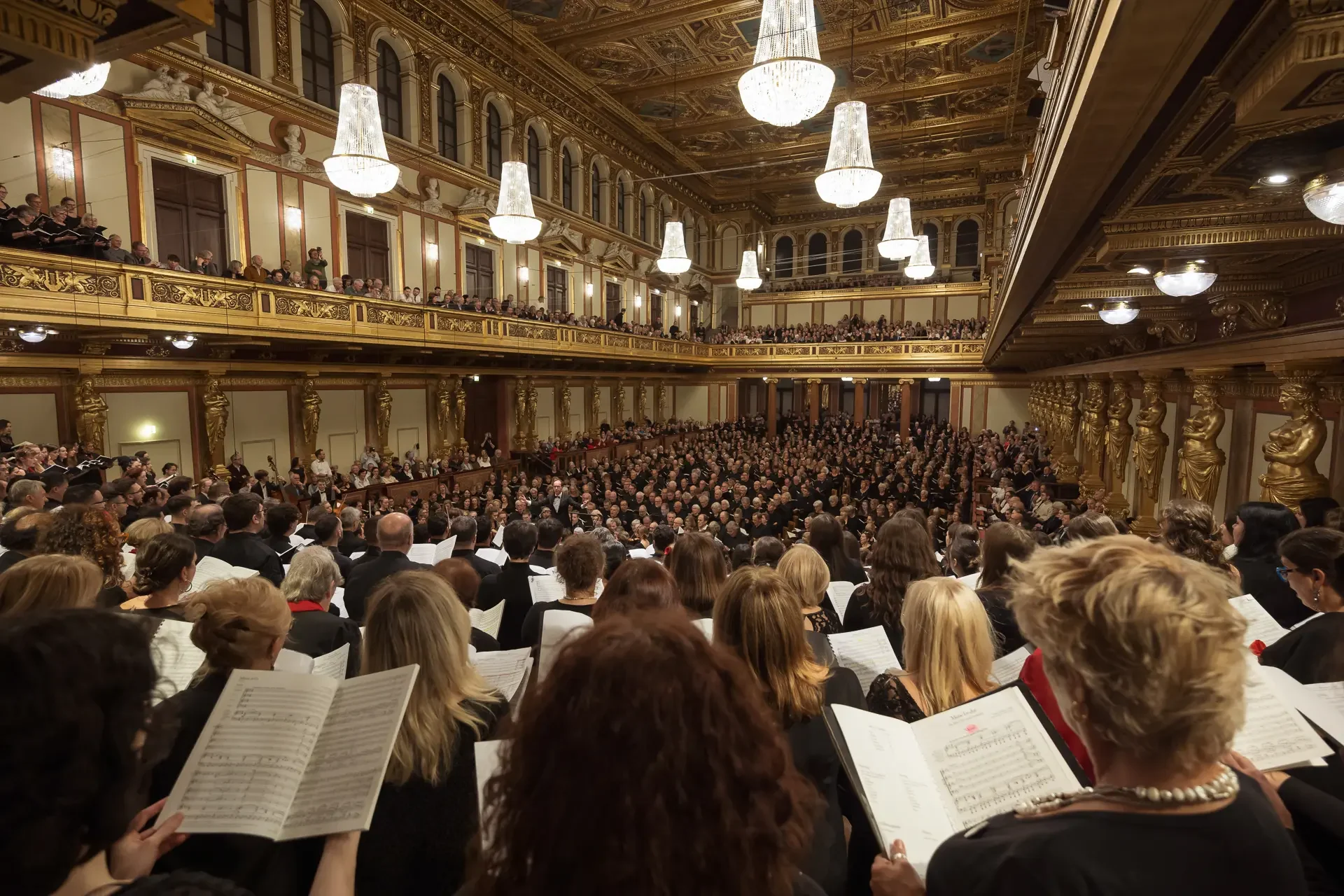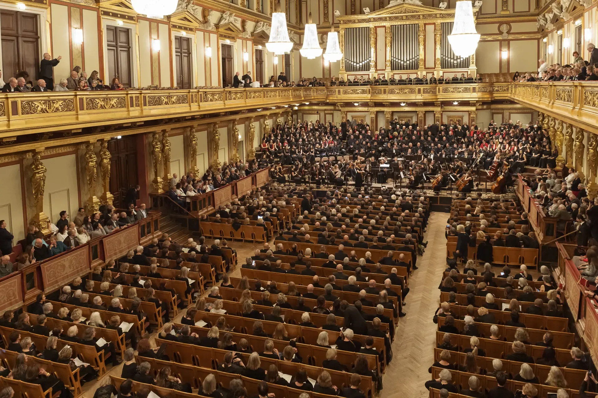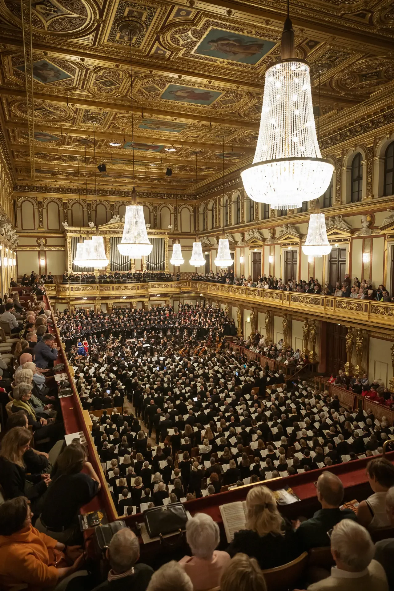 Η κεντρική συναυλία του φεστιβάλ στη Βιέννη δόθηκε στην ιστορική Χρυσή Αίθουσα του Musikverein, όπου 1000 χορωδοί από όλο τον κόσμο ένωσαν τις φωνές τους, ερμηνεύοντας την εμβληματική, τελευταία «Λειτουργία σε Μι ύφεση μείζονα» του Franz Schubert. Μαέστρος της βραδιάς ήταν ο Heinz Ferlesch. Η συναυλία ξεκίνησε με μικρά μουσικά δωράκια, καθότι 9 χορωδίες, ανάμεσα στις οποίες και η δική μας, είχαν την ευκαιρία να ερμηνεύσουν ένα σύντομο πρόγραμμα της επιλογής τους. Παραμένοντας πιστοί στο επετειακό έτος για τα 100 χρόνια από τη γέννηση των Μάνου Χατζιδάκι και Μίκη Θεοδωράκη, παρουσιάσαμε «Το Τριαντάφυλλο» και «Με το Λύχνο του Άστρου» υπό τη διεύθυνση της μαέστρου μας, Εριφύλης Δαμιανού.