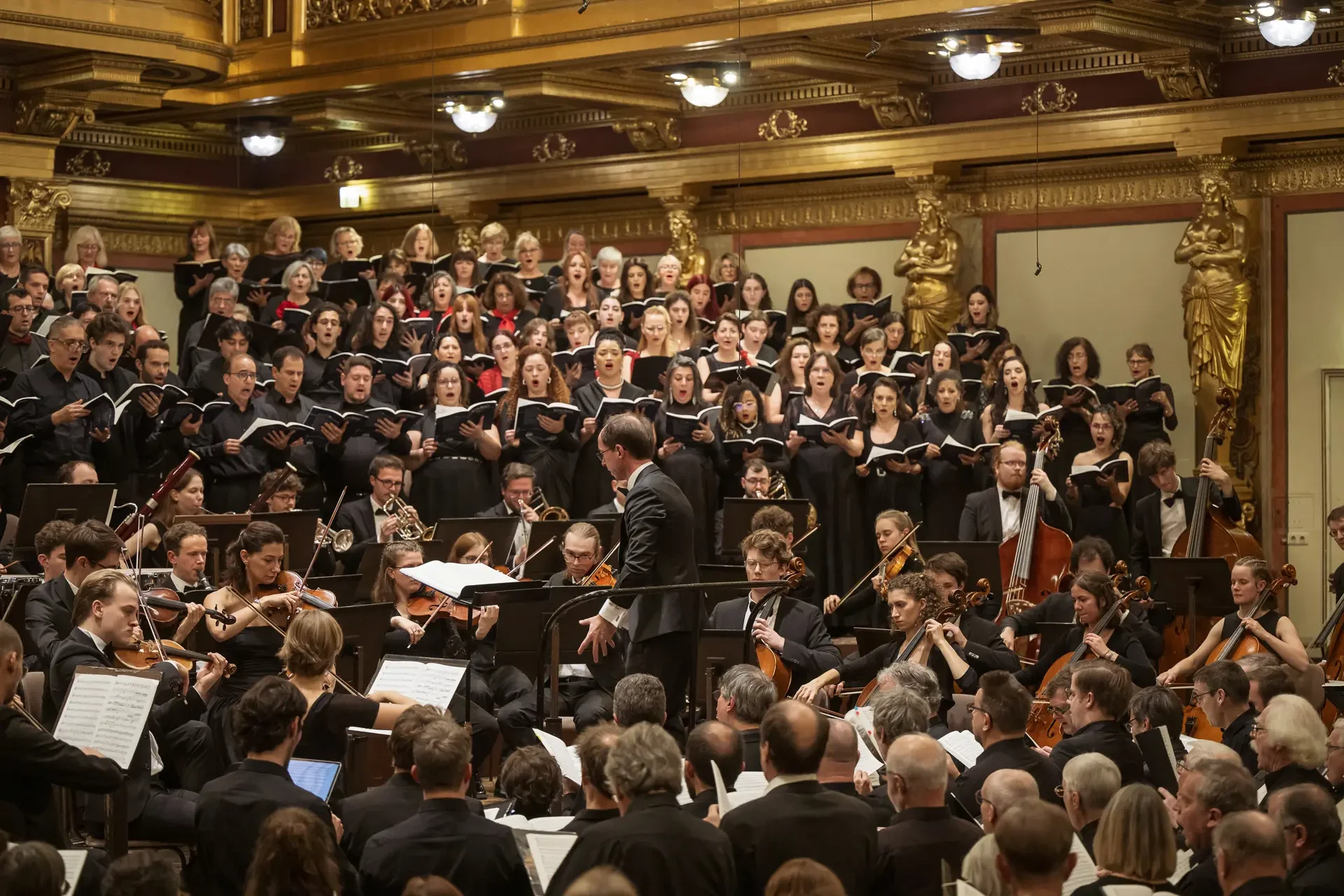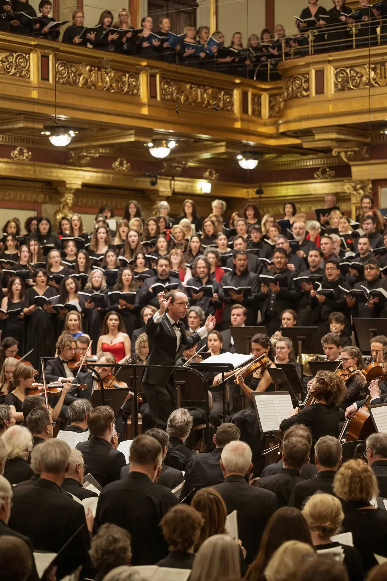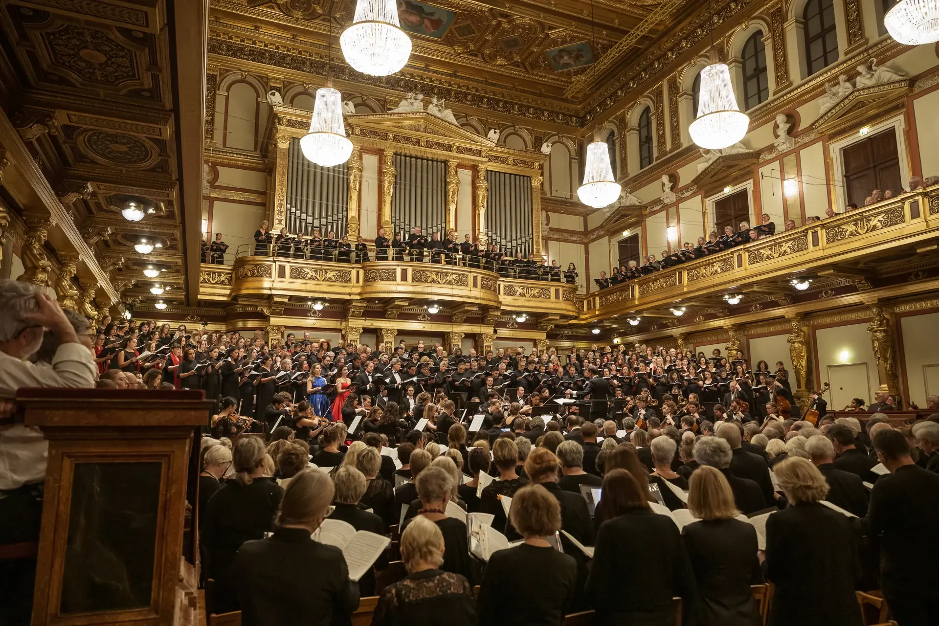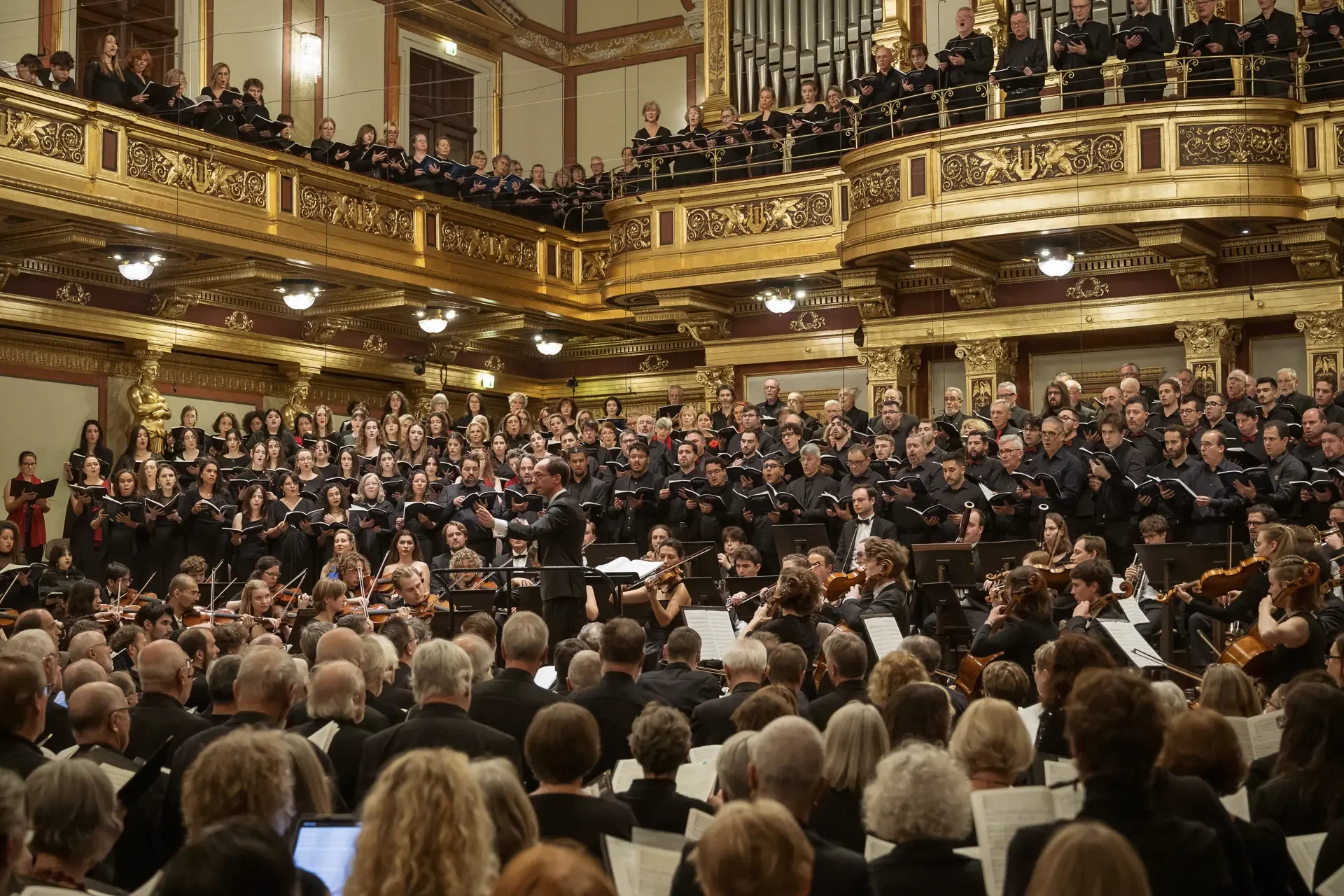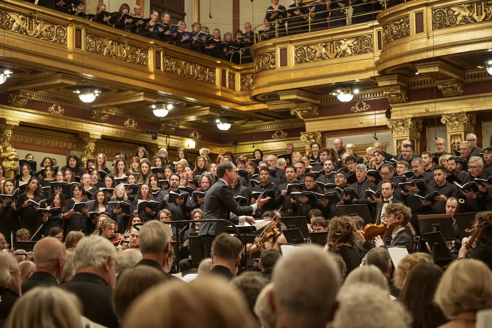 Η κεντρική συναυλία του φεστιβάλ στη Βιέννη δόθηκε στην ιστορική Χρυσή Αίθουσα του Musikverein, όπου 1000 χορωδοί από όλο τον κόσμο ένωσαν τις φωνές τους, ερμηνεύοντας την εμβληματική, τελευταία «Λειτουργία σε Μι ύφεση μείζονα» του Franz Schubert. Μαέστρος της βραδιάς ήταν ο Heinz Ferlesch. Η συναυλία ξεκίνησε με μικρά μουσικά δωράκια, καθότι 9 χορωδίες, ανάμεσα στις οποίες και η δική μας, είχαν την ευκαιρία να ερμηνεύσουν ένα σύντομο πρόγραμμα της επιλογής τους. Παραμένοντας πιστοί στο επετειακό έτος για τα 100 χρόνια από τη γέννηση των Μάνου Χατζιδάκι και Μίκη Θεοδωράκη, παρουσιάσαμε «Το Τριαντάφυλλο» και «Με το Λύχνο του Άστρου» υπό τη διεύθυνση της μαέστρου μας, Εριφύλης Δαμιανού.