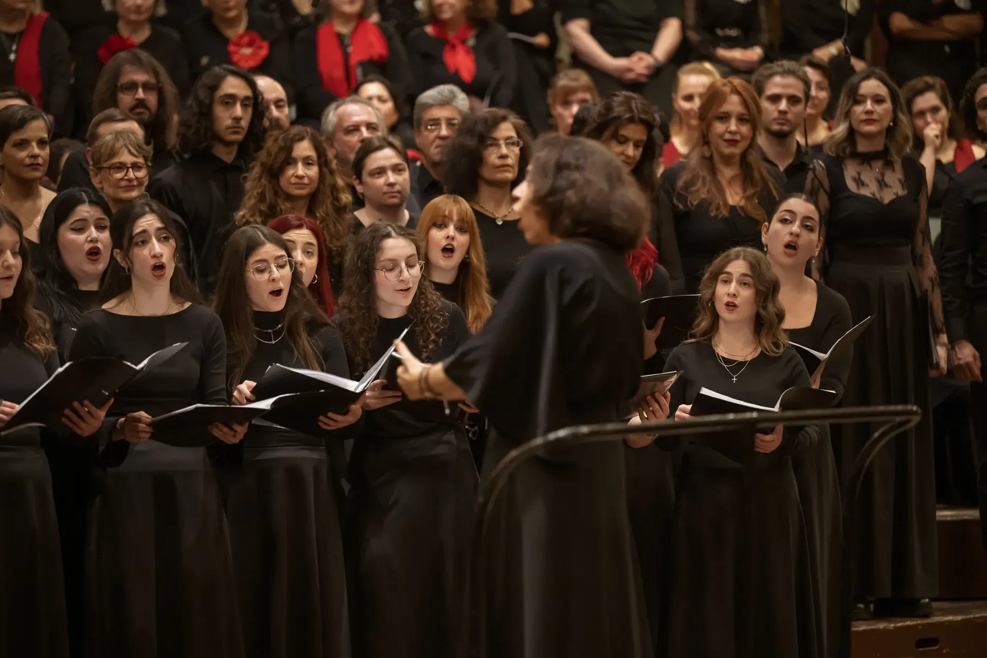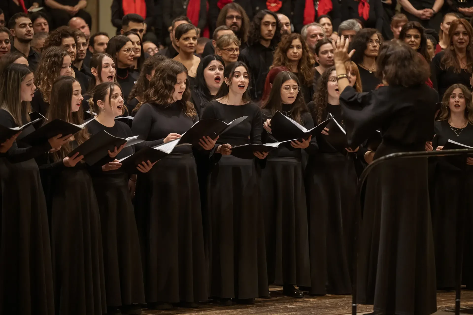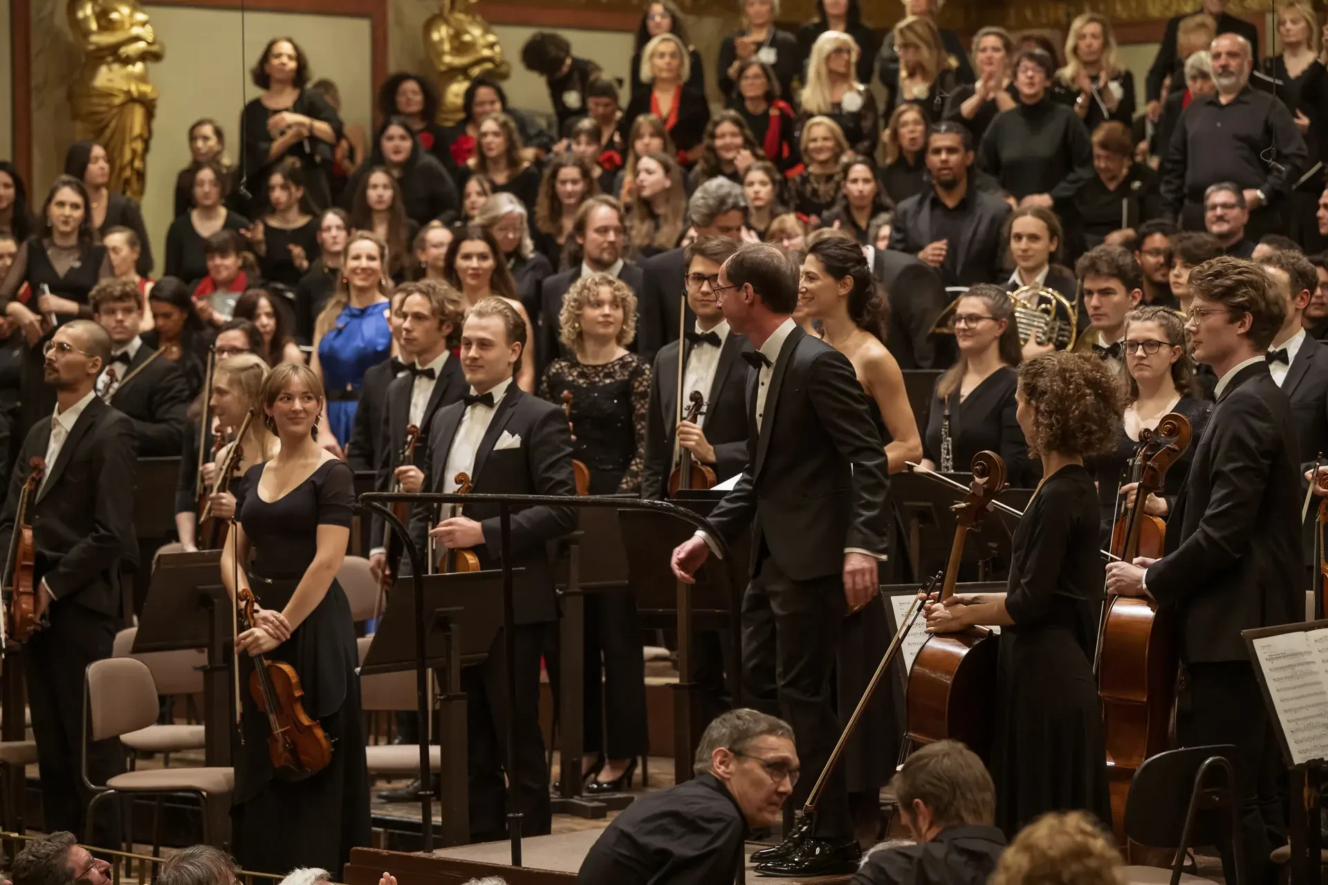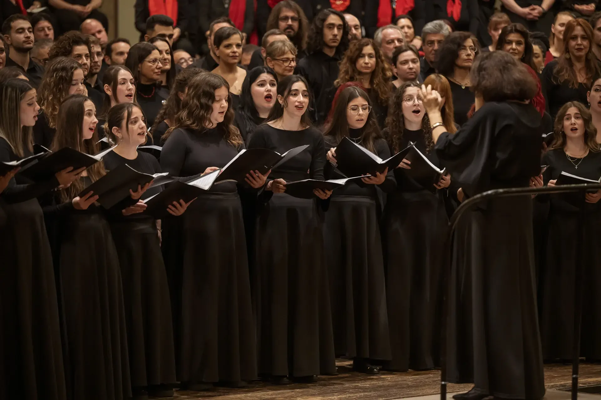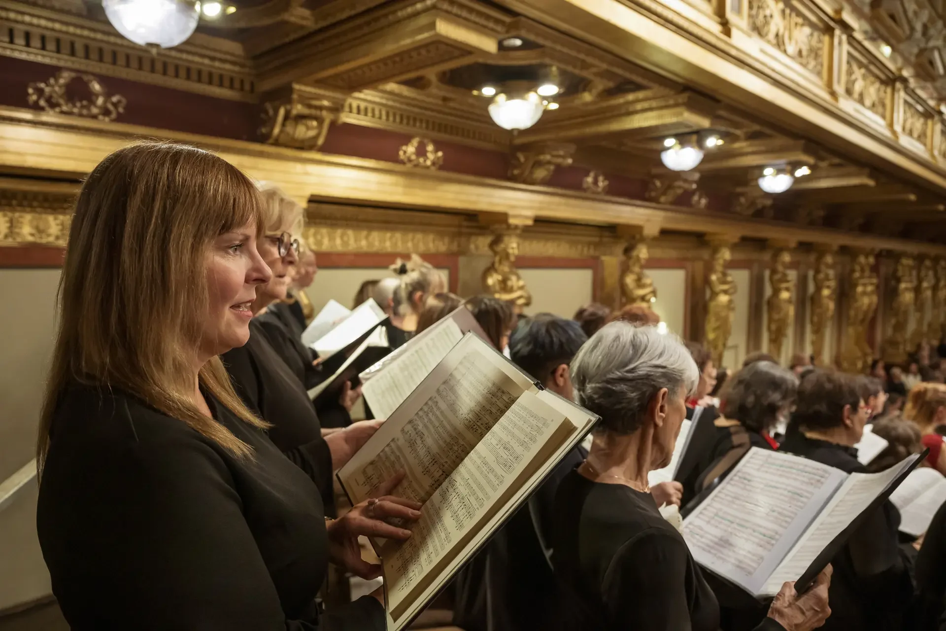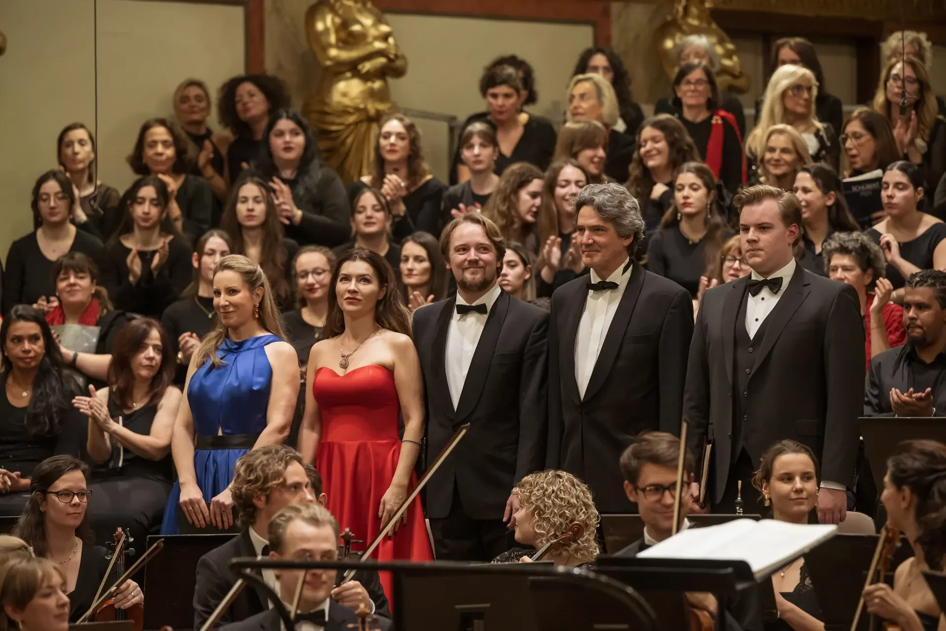 Η κεντρική συναυλία του φεστιβάλ στη Βιέννη δόθηκε στην ιστορική Χρυσή Αίθουσα του Musikverein, όπου 1000 χορωδοί από όλο τον κόσμο ένωσαν τις φωνές τους, ερμηνεύοντας την εμβληματική, τελευταία «Λειτουργία σε Μι ύφεση μείζονα» του Franz Schubert. Μαέστρος της βραδιάς ήταν ο Heinz Ferlesch. Η συναυλία ξεκίνησε με μικρά μουσικά δωράκια, καθότι 9 χορωδίες, ανάμεσα στις οποίες και η δική μας, είχαν την ευκαιρία να ερμηνεύσουν ένα σύντομο πρόγραμμα της επιλογής τους. Παραμένοντας πιστοί στο επετειακό έτος για τα 100 χρόνια από τη γέννηση των Μάνου Χατζιδάκι και Μίκη Θεοδωράκη, παρουσιάσαμε «Το Τριαντάφυλλο» και «Με το Λύχνο του Άστρου» υπό τη διεύθυνση της μαέστρου μας, Εριφύλης Δαμιανού.